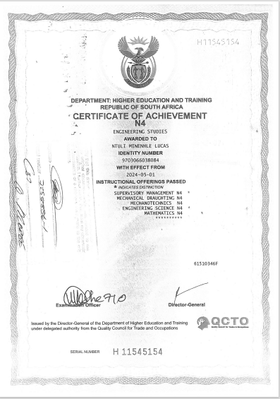 I am a dedicated and results-driven professional with an Honours Degree in Technology Education and over 4 years of experience as a Mechanical Technology educator, consistently achieving three consecutive 100% matric pass rates in Mechanical Technology.