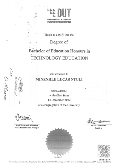 I am a dedicated and results-driven professional with an Honours Degree in Technology Education and over 4 years of experience as a Mechanical Technology educator, consistently achieving three consecutive 100% matric pass rates in Mechanical Technology and a 100% pass rate in Mathematical Literacy. Skilled in classroom teaching, workshop training, and learner mentorship, I bring strong communication, leadership, and problem-solving abilities. Trained at the Amajuba Workshop, I hold practical expertise in technical and safety standards, further complemented by my SACE registration as a professional educator.
